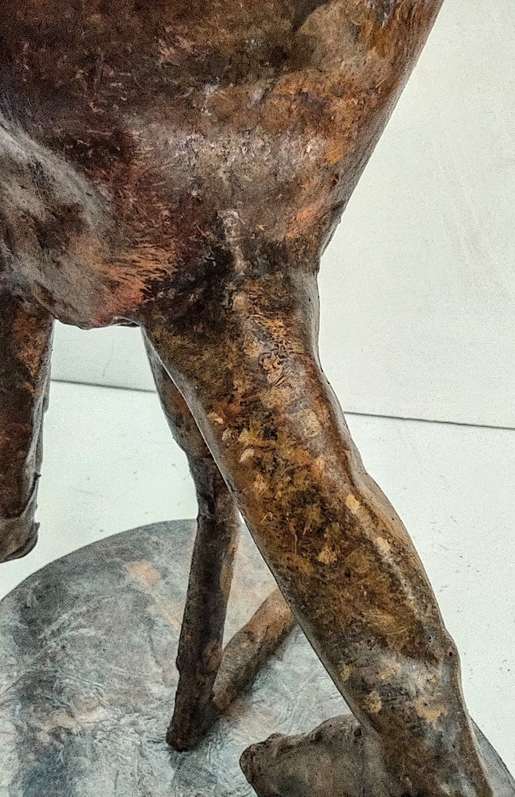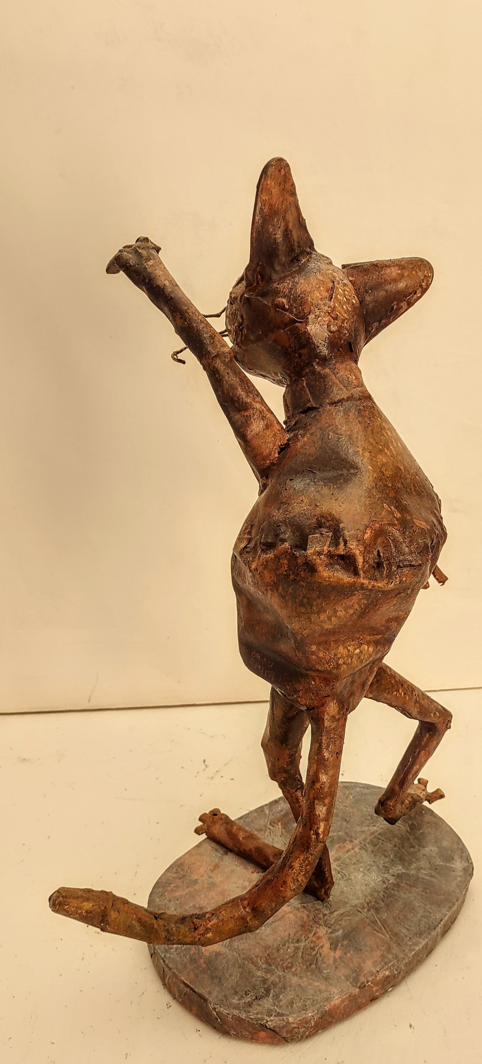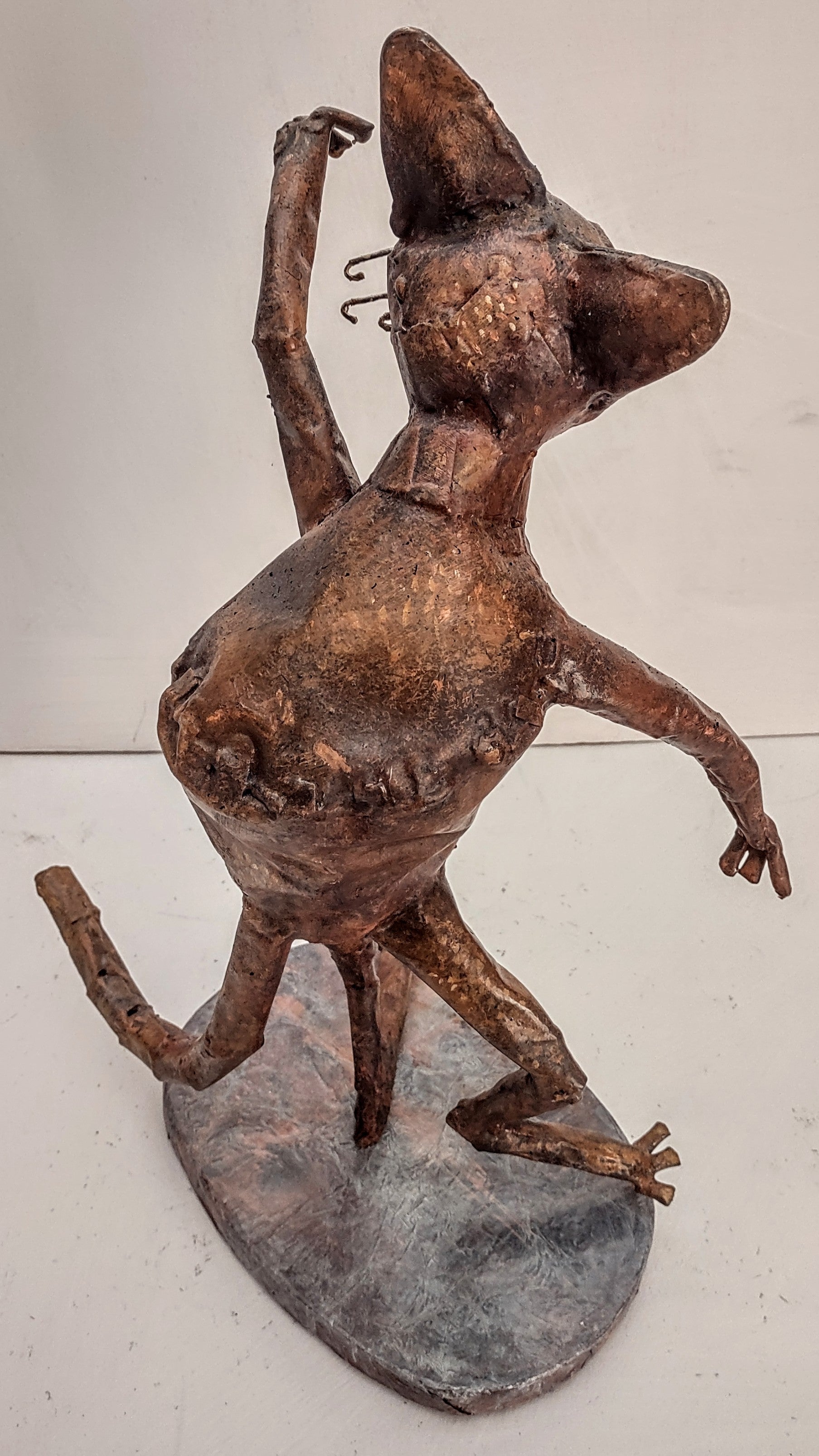 The surface is a painted patina involving many layers of paint, delicately applied. The base the Cat stands on is wood covered with copper, then given a delicate wash of white oil paint.