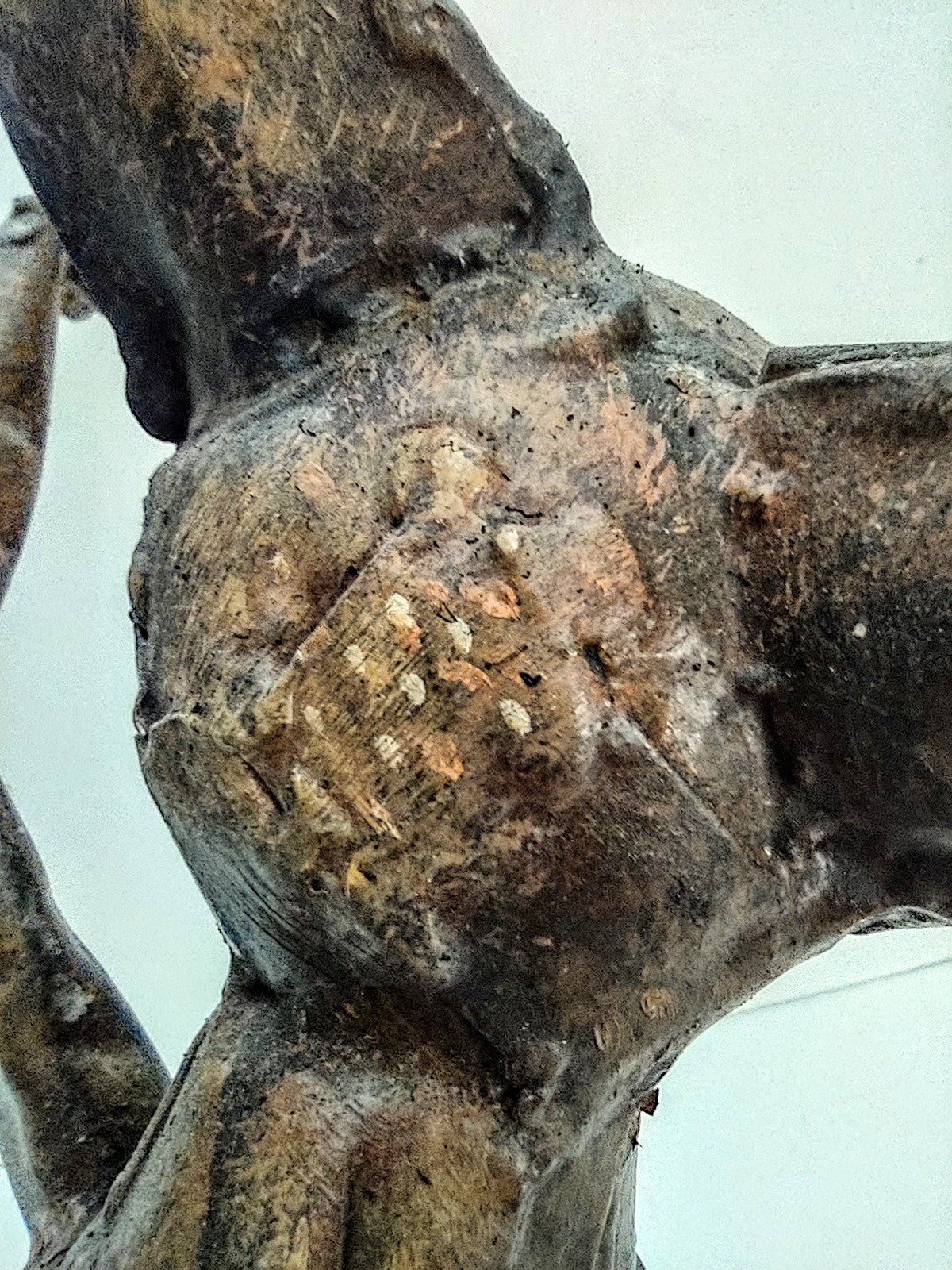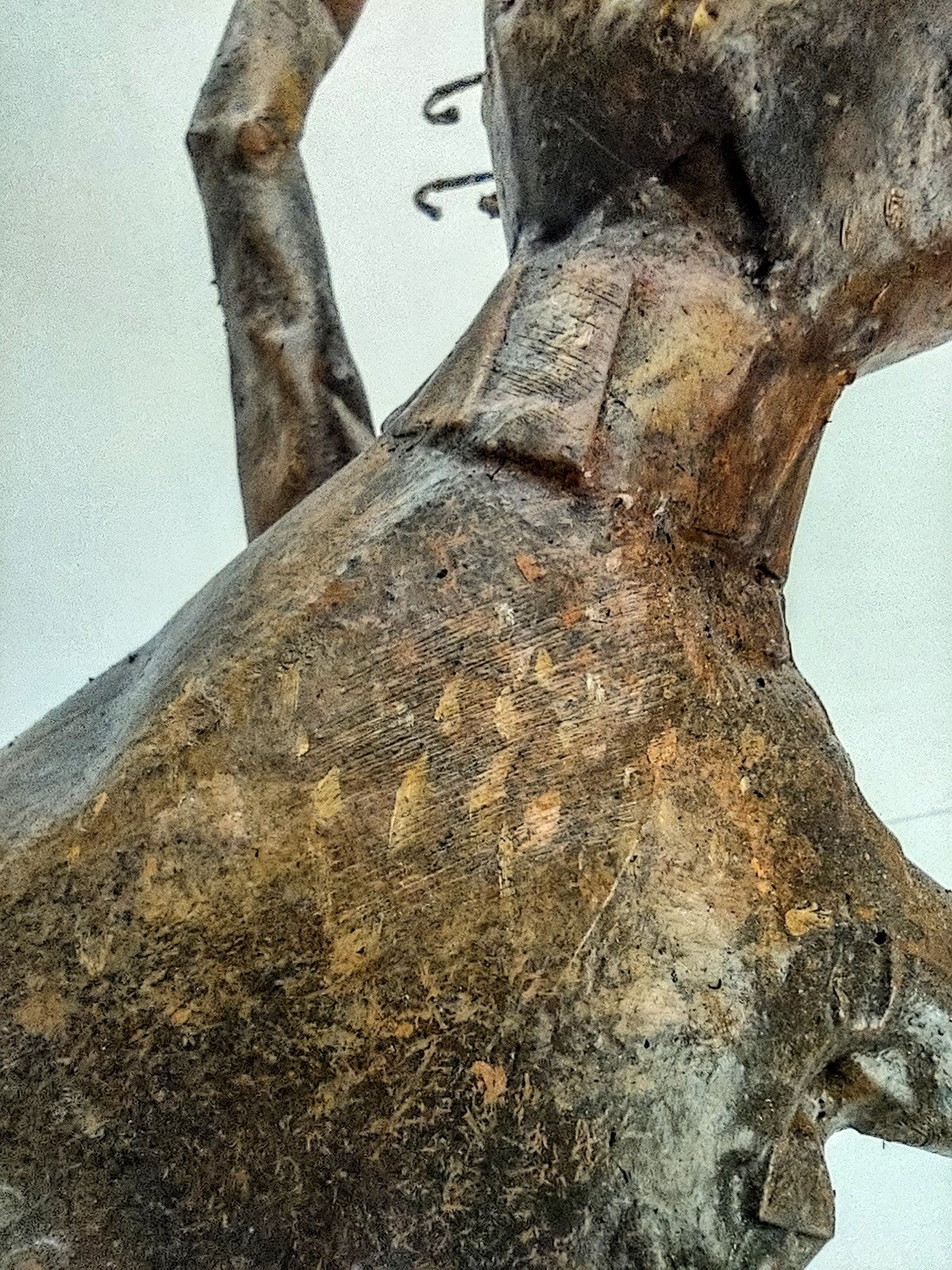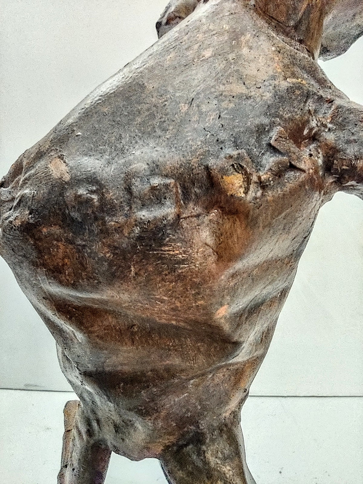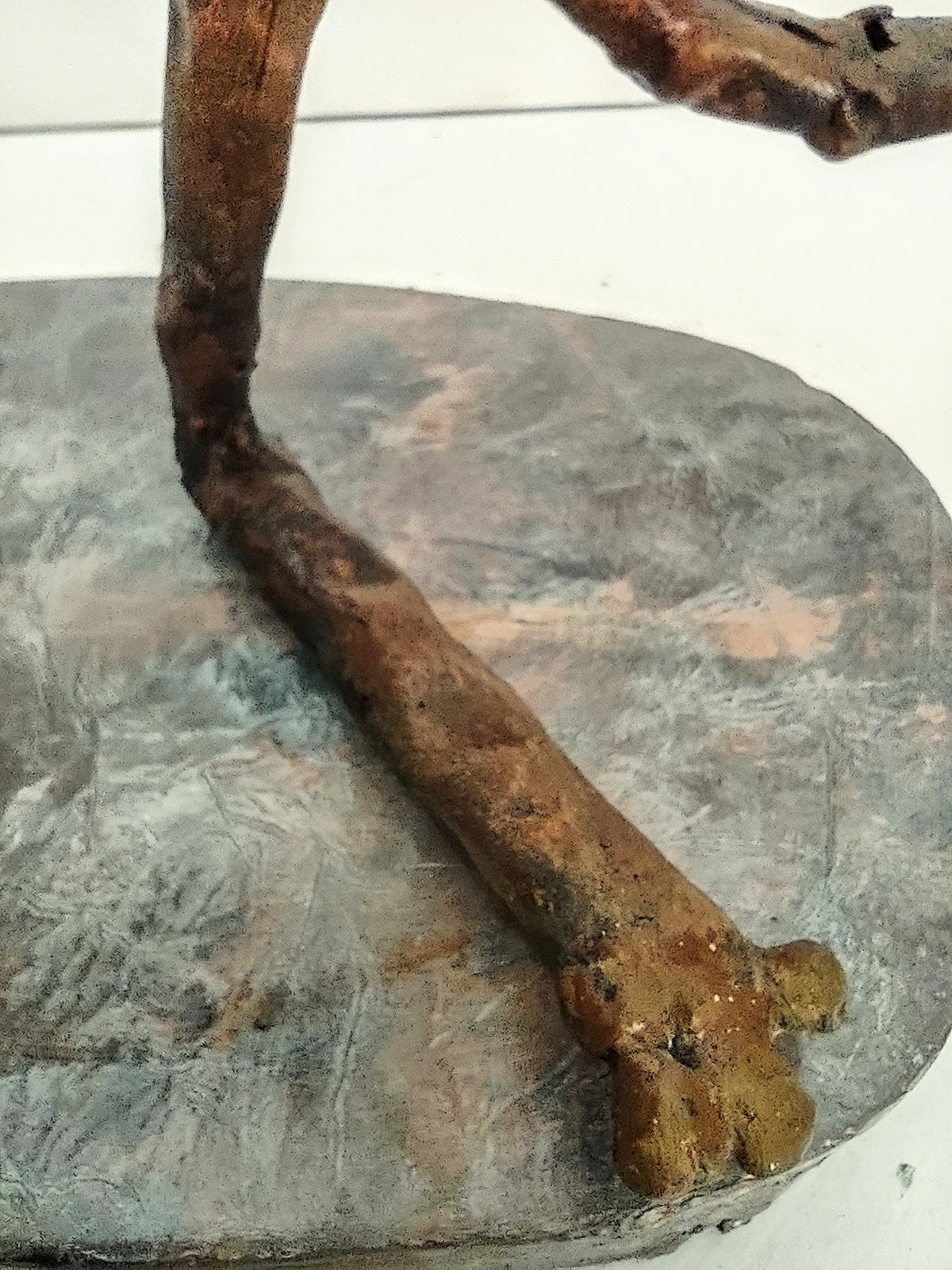 The surface is a painted patina involving many layers of paint, delicately applied. The base the Cat stands on is wood covered with copper, then given a delicate wash of white oil paint.