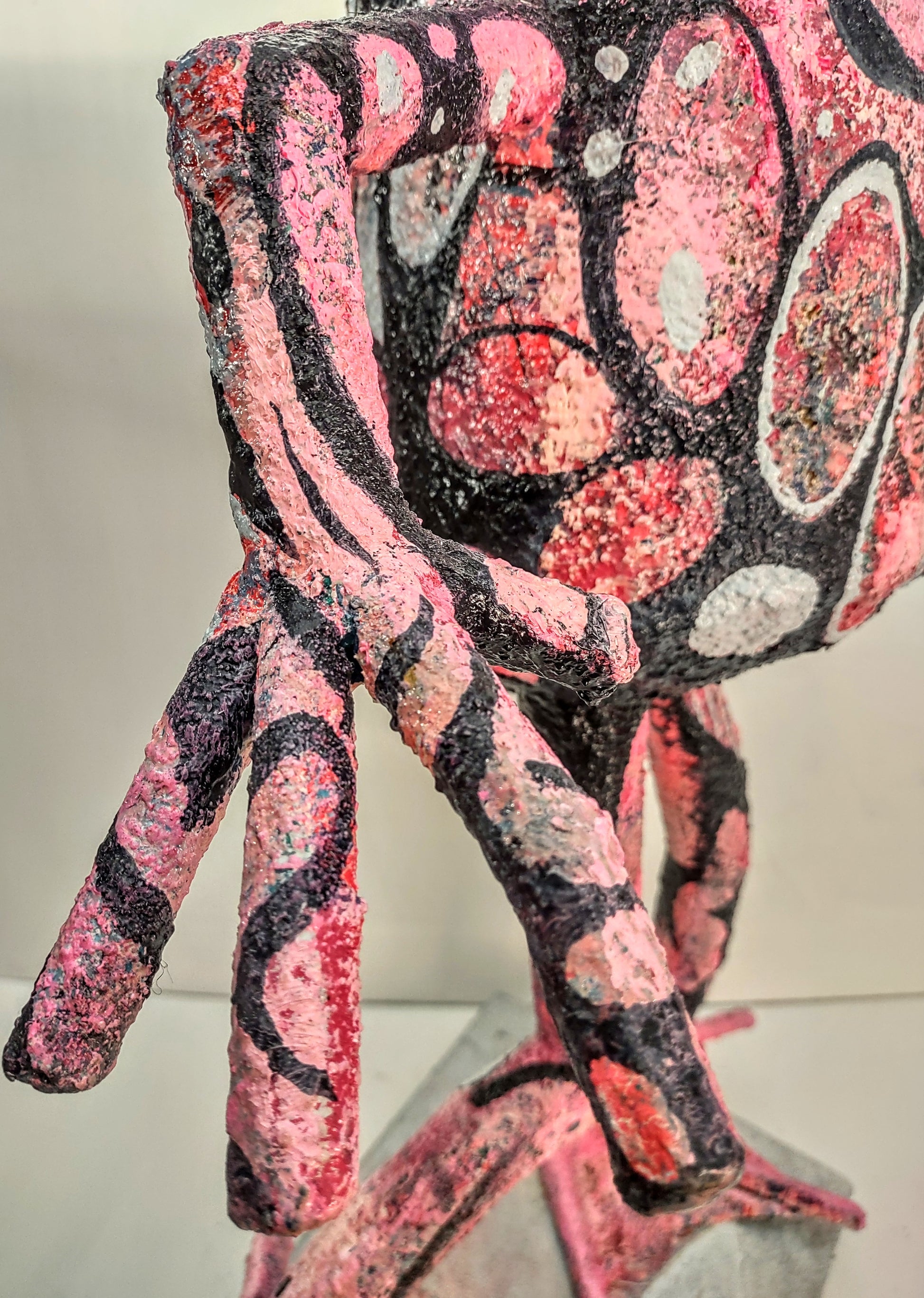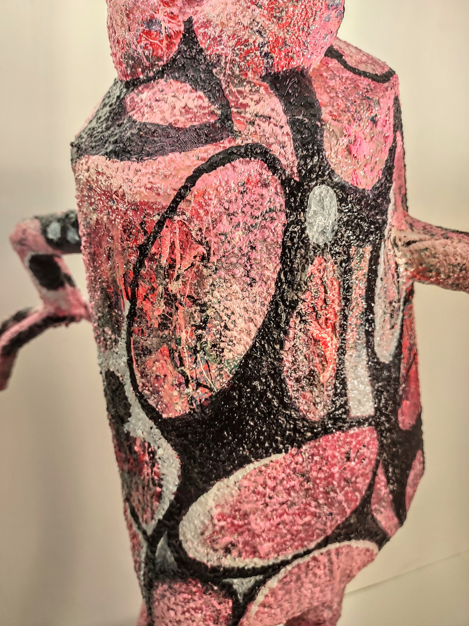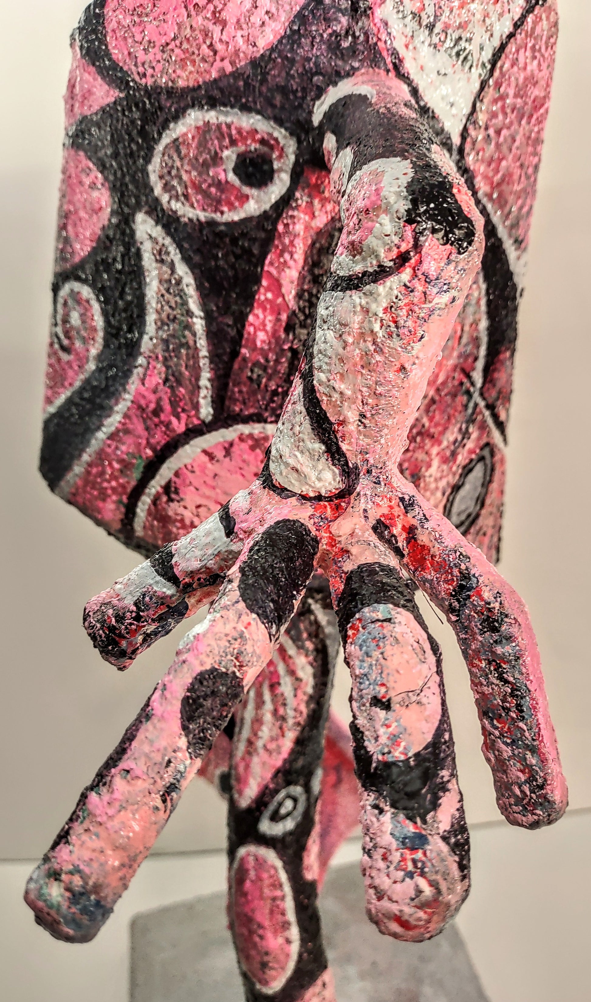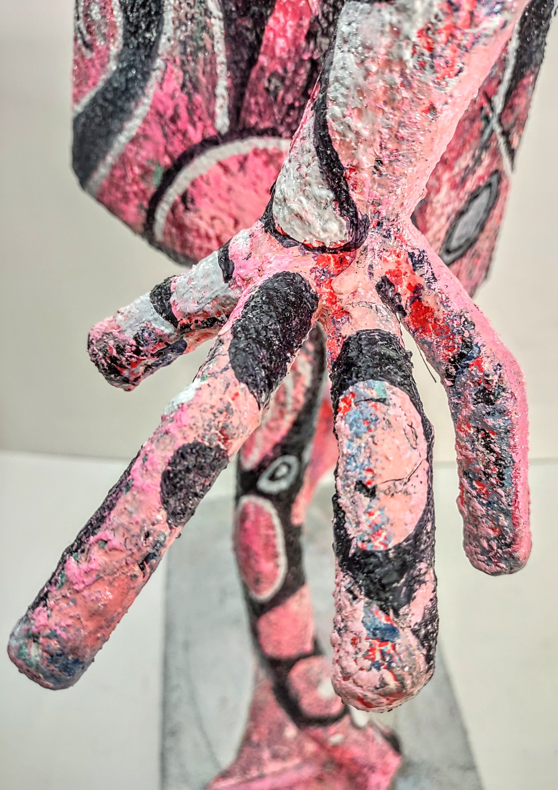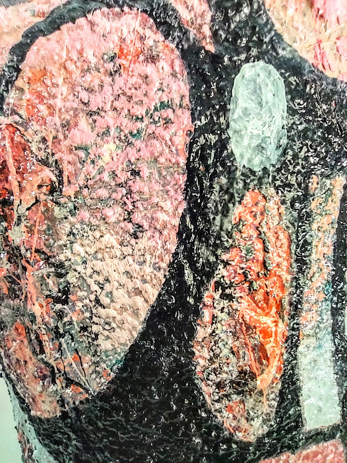 The wonderful texture I have achieved here is partly by applying sand. The way I did this, I began with making a very textural surface. Then, over the top of that, I painted a design that is, well, flat or slick - the black design. I wasn't happy enough just with the pink texture. I had to make it more interesting. I achieved that.